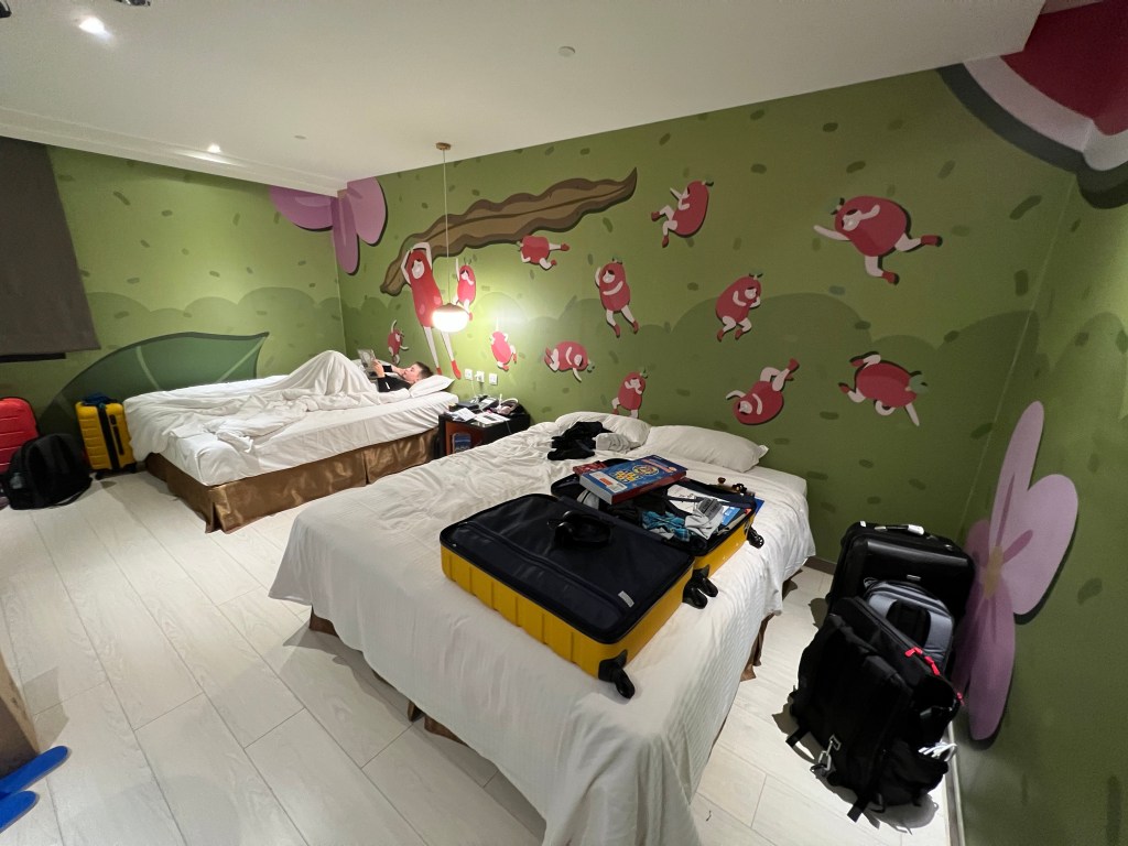 Everyday, we had to swab a COVID test and check in via the Line app with our names, health status (“Negative tests, no symptoms, we feel fine, and no we haven’t left the room.”). There was no laundry service available, so we were creative with what we wore, “repurposed”, and how we handled dirty clothes. There was nowhere to put suitcases in this room, and we had a LOT of them, so the floorspace Tetris was a daily challenge. Cute wallpaper, though.